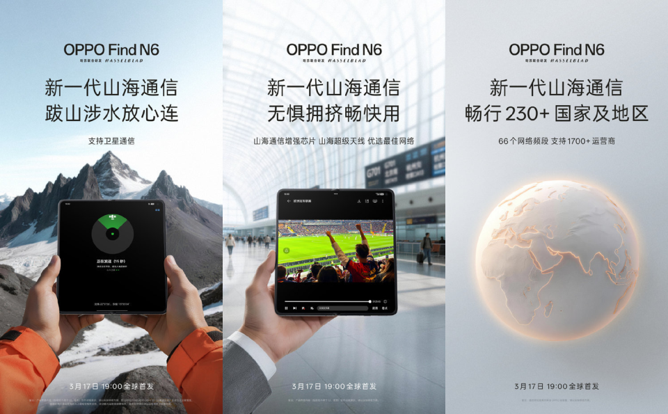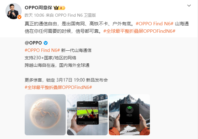 日前,@OPPO 连续发布了三张Find N6新机的官宣预热海报,并配文称,“#OPPO Find N6# 新一代山海通信 支持230+国家/地区的网络跨越山海自在连,国内海外全球通”。随后, @OPPO周意保 转发了这条微博,并补充称,“真正的通信自由,是出国有网、高铁不卡、户外有底。#OPPO Find N6# 山海通信在你任何需要的时候,信号都可靠。#全球最平整折叠屏OPPOFindN6#”。